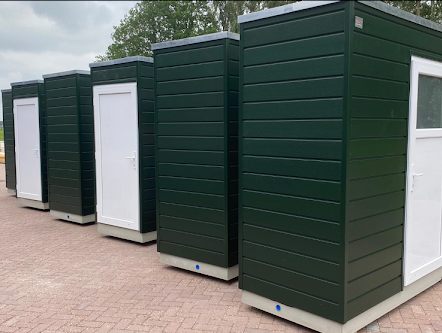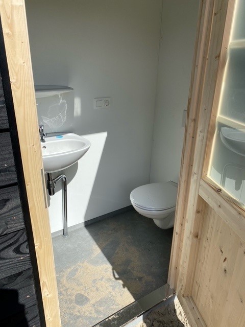 De Compact campingbadkamer staat op een betonen plaat en is makkelijk aan te sluiten op riool, water en stroom. Door de stabiele ondergrond is deze snel waterpas te stellen en kan hij op elk gewenste plek geplaatst worden.